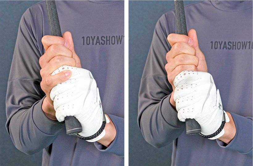 右手は指先で握り、左手は小指球をグリップの真上に乗せて握る
