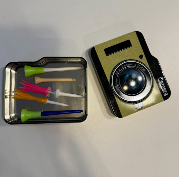 ティが入るカンカンを探しました。ロングティってけっこう長さがあるので、自分が使っているティが入るかどうか不安だったら、買い物時に1本持って行くと安心です。ここにティやグリーンフォークなどをまとめて入れておきます。