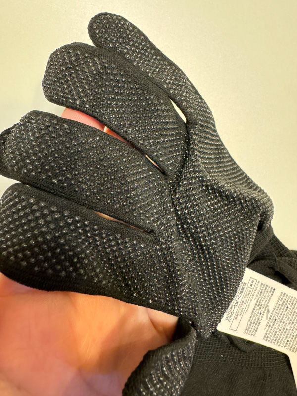 手のひら側がブツブツしていて滑り止め(塩化ビニル樹脂)がびっしり付いているグローブです。ゴルフグローブはクラブを振った時に滑って飛んでいかないようにという役割がありますが、その点では、ナシよりのアリではないか…と思いました。