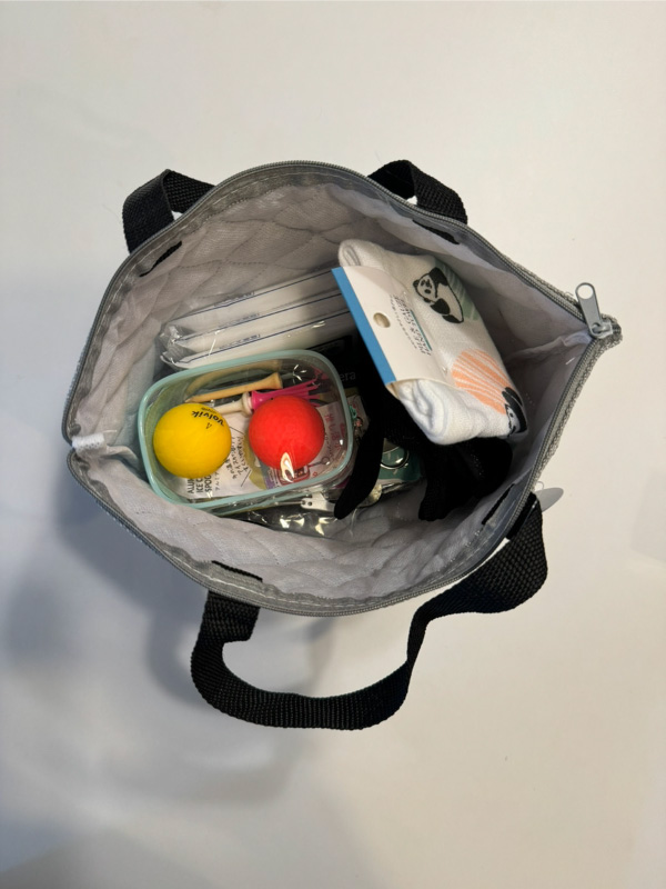 今回購入したものをラウンドバッグに入れてみました。なんかいい感じにいろいろ入りますよ。今回の購入品の他にも小銭、サングラス、飲み物、お菓子など必要な物を入れてラウンドに繰り出しましょう。