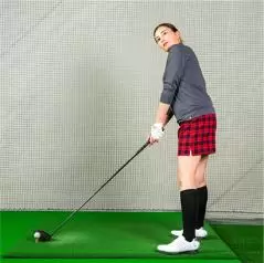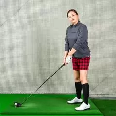 1.飛球線と平行に立ち、上体を起こした姿勢でクラブを胸の前に真っすぐ立てる