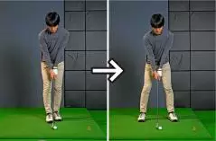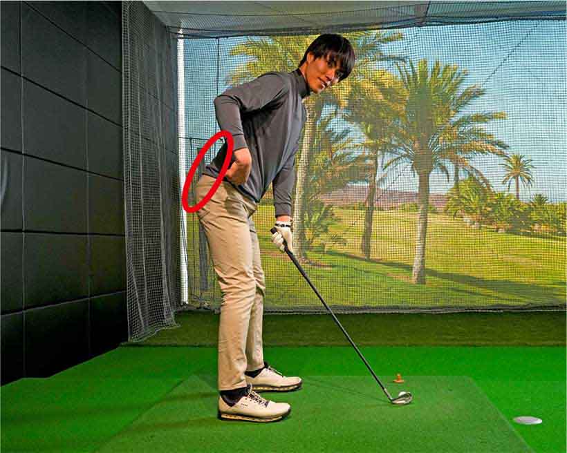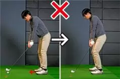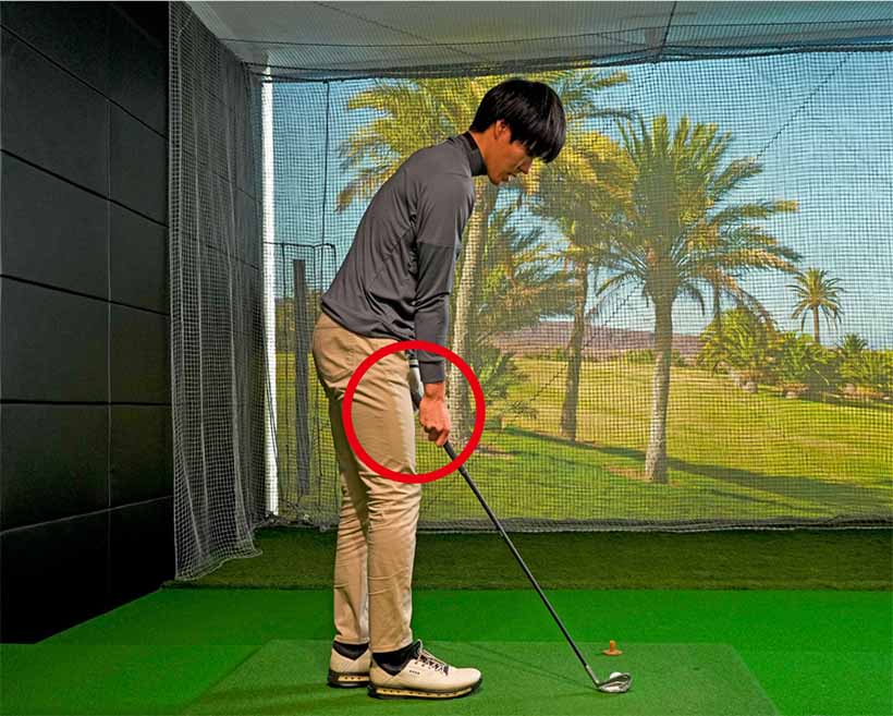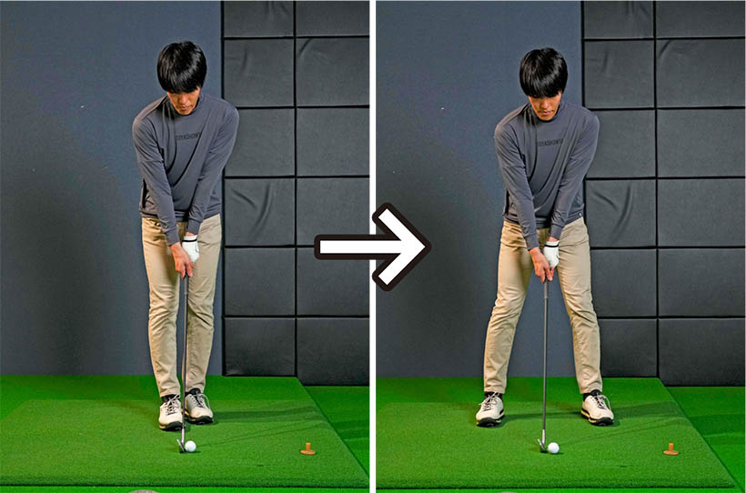 ボールから離れた体勢でアドレスに入るとボールにもっと近づこうとして骨盤が立ち、カカト体重の腰高の姿勢になってしまいます。これではスイング中のカラダのバランスが崩れやすく、キレイなスイングができなくなります。