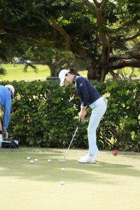 大会1日目の朝、練習グリーンからティイングエリアに向かう間も、「ファイティン!」とギャラリーから声をかけられる人気っぷり。照れながらも笑顔で対応するアン シネの5年ぶりのファーストティショットはフェアウェイキープとナイスショット。美貌だけでなく実力も見せつけたいところ。