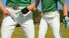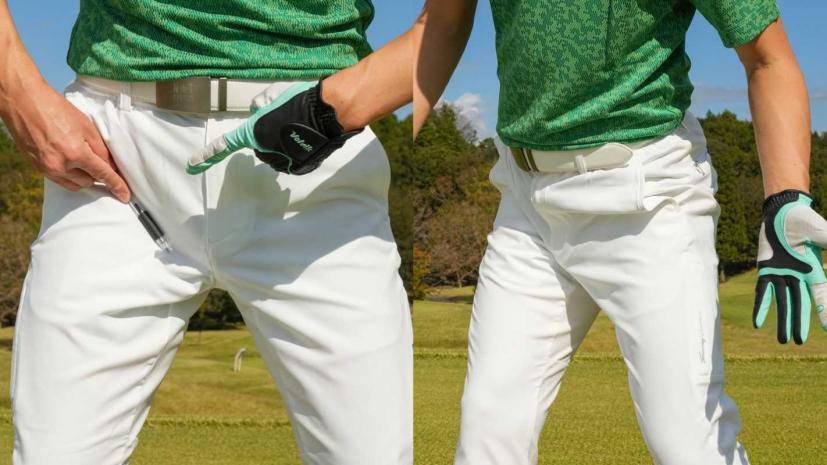 正しく体重移動できているかどうかは、右足の付け根にペンを挟むドリルがおすすめです。腰が右に回ってもペンが落ちなければ上体が股関節に乗れています。落ちてしまう人はスエーして上体が伸び上がっています。誰かにクラブのグリップエンドで、右腰をグーッと押してもらってもいい。いずれの場合も右ヒザは伸びて構いません。腰が回りづらい人は、右ヒザを伸ばすくらいの感覚でやっていただくといいと思います。