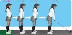 STEP3から体の角度、重心はキープ。腰の高さでクラブを持った姿勢(写真下)から、ゆっくりとクラブを下ろす。手元がアゴの真下におさまればOK。