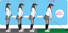 飛ばせる構えを作るには直立した姿勢からお尻だけを後ろに引く、そこからヒザだけを前に出して母趾球で重心を感じるようにする。その姿勢をキープしたまま、手元をアゴの下にして構えるだけ。重心はやや高めに感じるくらいでOKです。前回(第1話)、振り子運動で打つという話をしましたが、重心が高いほうが振り子の軌道が大きくなります。極端に前傾を深くする必要もありませんし、棒立ちに近い姿勢が実は1番飛ばせます。