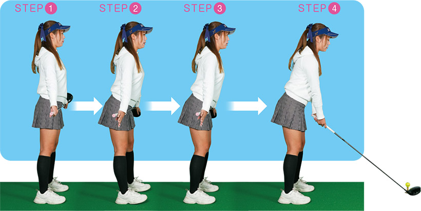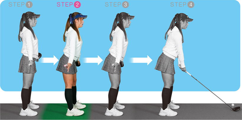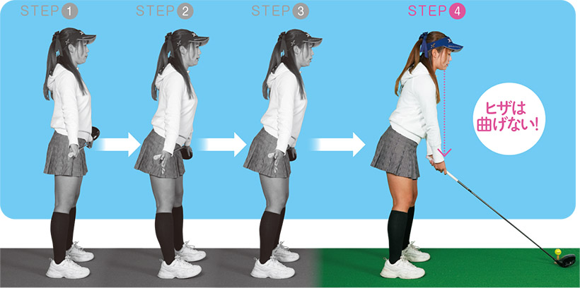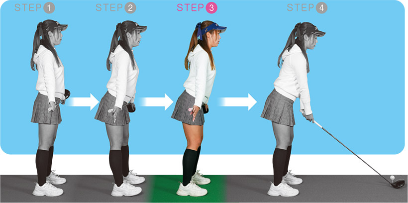 STEP3から体の角度、重心はキープ。腰の高さでクラブを持った姿勢(写真下)から、ゆっくりとクラブを下ろす。手元がアゴの真下におさまればOK。