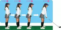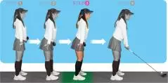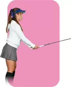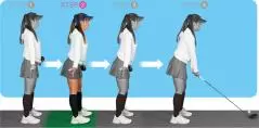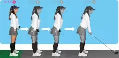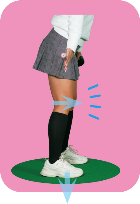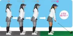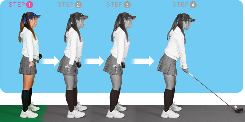 ヒザ、腰、背中を伸ばした姿勢で直立する。直立したときにアゴは真下に向ける。最初は骨盤のポジションをチェックするために、シャフトを腰に当ててやってみる。