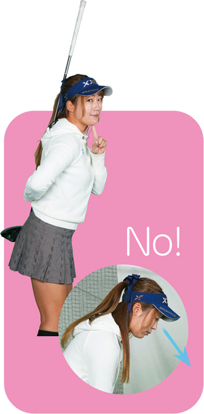 ボールを見る意識が強すぎると、顔をボールに向けてしまうのでアゴが首にくっついてしまう(×)。 顔を正面に向けたまま「下目」でボールを見る。