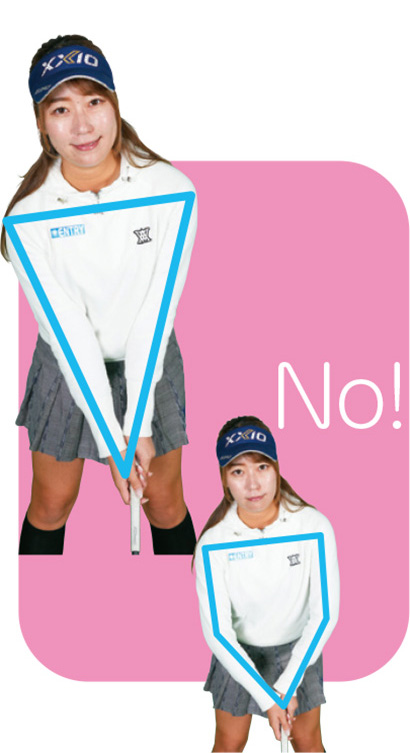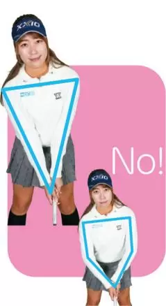 両ヒジが伸びて両腕が三角形になっていることで安定した振り子軌道になる。両ヒジが曲がって五角形になっていると腕と体が分離して手打ちになりやすい。