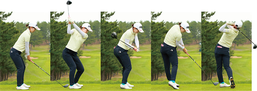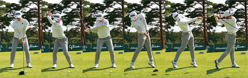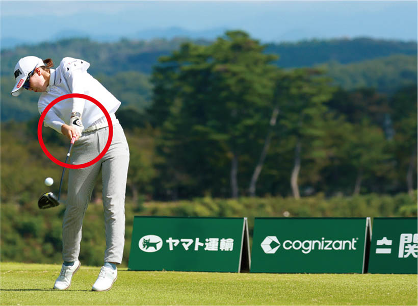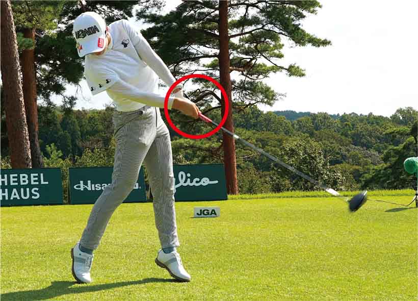 蛭田みな美 「グリップエンドが体から離れないことを意識していますが、そのために左ワキを閉めたまま振り抜くように心がけています」。