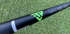 デザインはマット仕上げのブラック塗装に、グレーのロゴとグリーン系のロゴマーク。これがなんともシックな感じで高級感もありカッコいい。ロゴデザインも個人的にはかなり好きです。ロゴのプリント面の裏面は全くなんのプリントもなく真っ黒。なので、裏刺しをすると、マット仕上げの真っ黒のシャフトになるんです。これがまたなんともカッコいい。光を反射して眩しくなったりもしないし、ヘッドに集中できる感じもします。