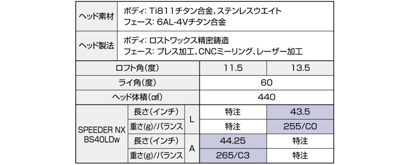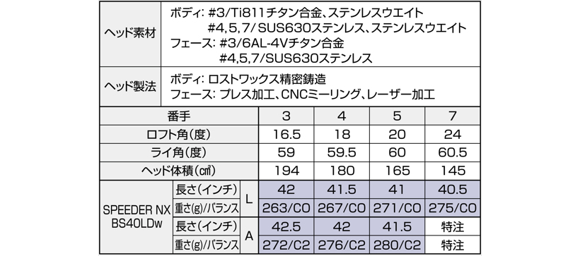 ※SPEEDER NX BS40LDw、Diamana BS50LDIIのスペックは、3Wの値です。