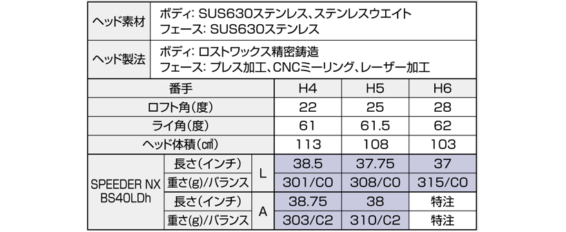 ※SPEEDER NX BS40LDh、Diamana BS50LDhIIのスペックは、H4の値です。