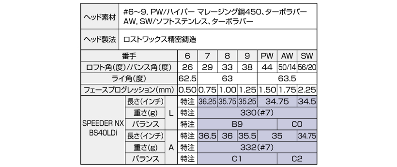 ※SPEEDER NX BS40LDi、Diamana BS50LDiIIのスペックは、#7の値です。