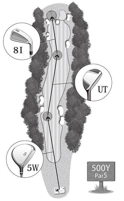 パー5ホールはご存知のように3オン2パットがベースですが、攻め方は何通りも考えられます。たとえば500ヤードとして、ティショットがいい当たりでフェアウェイキープ。残りは260ヤードです。そこからは2打目でなるべくグリーンに近づけて3打目で短いクラブを使うか、あるいは8番アイアンを2回使って3オン狙いで行くか。どちらも正解ですが、ショットをうまくつなぐためにはプレッシャーの少ない攻め方を優先するのが上手なマネジメントです。