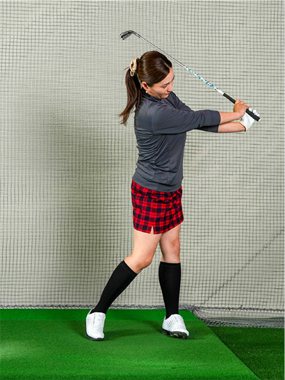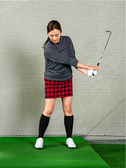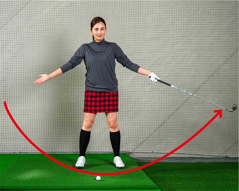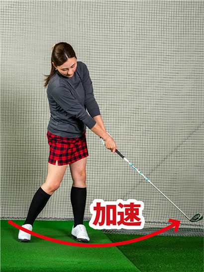 両手が腰くらいの高さでも手首を柔軟に使えばキレイな円を描くようにスイングしやすく、クラブヘッドが自然に加速します。