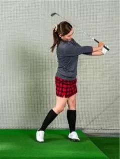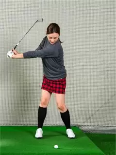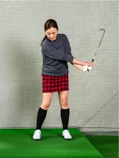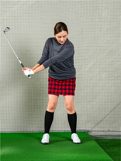 ハーフスイングとは腰くらいの高さよりも少し大きいくらいの振り幅です。クラブの重さ感じられるくらいにグリップを柔らかめに握り、ボールをしっかり打ち抜きましょう。