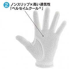 手のひら側は「ベルセイムクールⓇ」メッシュ構造で通気性に優れている。さらにメッシュ構造の凹凸により、グリップ力もアップ。