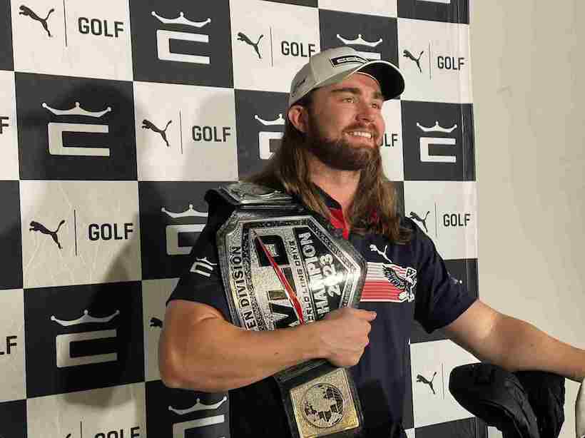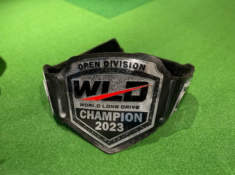 こちらがドラコン選手権のチャンピオンベルト。今年も優勝を狙っているというカイルだが、次回はもっと ベルトを軽くしてほしい 、とのこと(笑)。今回のような飛行機での移動の際が大変なのだとか。王者ならではの悩み。そんな中持ってきてくれたカイル、優しい〜。