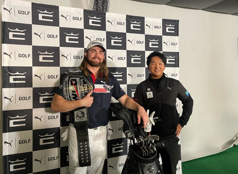 今回、初対面のカイルとコブラプーマゴルフのアンバサダーでもある進藤大典さん。カイルの生ドライバーショットを楽しみにしていたという進藤さんだが、発表会前に試し打ちをしていたカイルはなんと、8アイアンを打つや否や、ネットに3発、穴を空けてしまったのだとか。「とにかくパワーがすごい!」と進藤さんも大興奮で、すぐさま進藤さんのインスタグラムのストーリーズにて公開。進藤さんのSNSを見たゴルフ関係者、フォロワーのゴルファーたちから連絡が絶えずきていたそう。