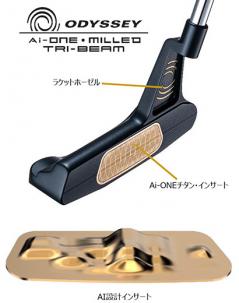 「Ai-ONE MILLED TRI-BEAM パター」では、Ai-ONE MILLED パターから64チタン製AI 設計ミルドインサートが引き継がれた。ブロンズゴールドカラーを纏ったこのインサートの背面には、AI の設計による複雑な隆起が形成されており、オフセンターヒットしてもボールスピードの低下が最小限に抑えられるる。このインサートは従来のパターよりも21%ターゲットに寄るデータが実証されていると言う。