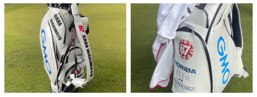 こちらのシンプルながら、華やかさのあるキャディバッグは、脇元華プロのもの。2020年のGMO契約の時からの相棒のようで、ほとんどの試合にこちらのキャディバッグで参戦。自身の名前、”HANA”に掛けた数字”87”のロゴがポイントとなっている。稀に、ブラックのクールなバージョンを使用する際も、このロゴは欠かさずついている。