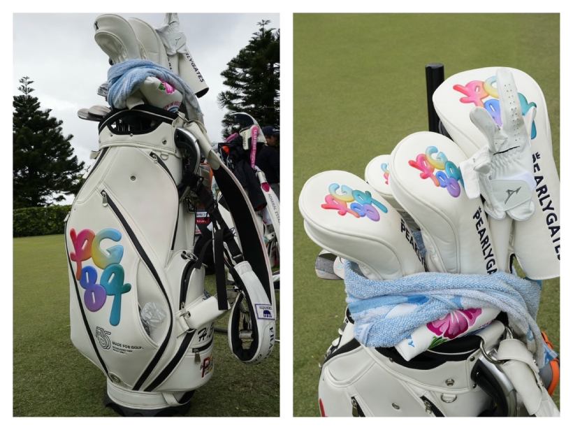 カラフルなロゴデザインが可愛いこちらのキャディバッグは、原英莉花プロのもの。35周年を迎えたパーリーゲイツを記念して作られた特別なデザイン。35周年の勢いをそのままデザインしたようなシンボルマーク、”PG84”がぷくっと浮き出ているところもポイント。こちらのデザインは、日本だけでなくパーリーゲイツコリアでも展開しているのだとか。