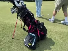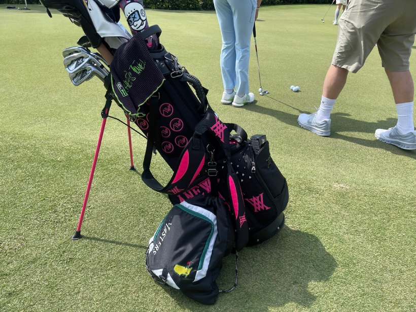 ブラック×ピンクが目を引くこちらのキャディバッグは、元祖セクシークイーン・アン シネプロのもの。今年から、ANEW GOLFとの契約を結んだアン シネはこちらのキャディバッグをチョイス。