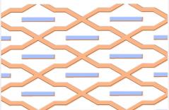 オレンジで示したスリットが心地よい打感と打音を実現し、青で示した平行のスリットがボールのディンプルに噛み合い、転がりと直進性をよくする構造。