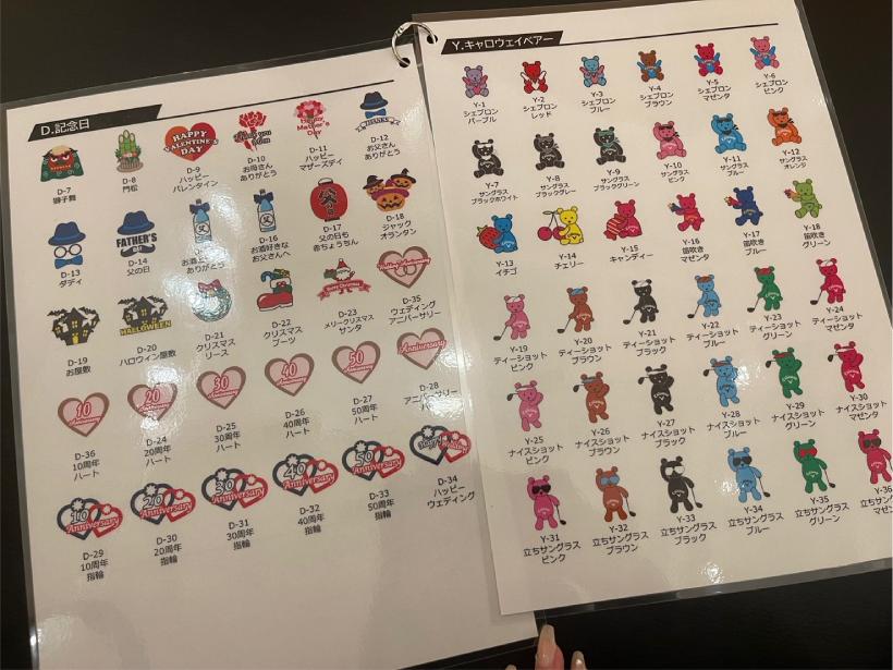 そして、なんと言っても、イラストの種類の豊富さ!イラストはカタログから選ぶことができるのだが、多過ぎて決めきれないほど豪華。私も大好きなキャロウェイベアシリーズだけでも、ゴルフをしているバージョンや、サングラスバージョン、ハートバージョン、キャロウェイの象徴であるシェブロンマークを持っているキャロベアなど、その数なんと10パターン。その他、お誕生日や記念日、バレンタインデーのマークなど、多様多種のラインナップとなっている。