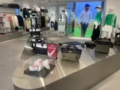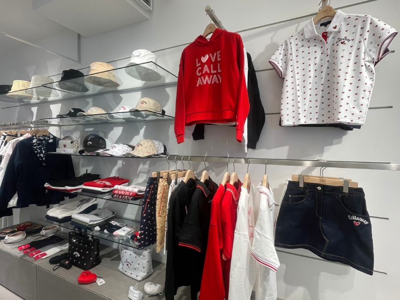 一階には、キャロウェイのアパレル、アクセサリーやゴルフグッズ、シューズなどが勢揃いしており、メンズ、レディース共に種類も豊富しでショッピングにはもってこいの場所。最新の「キャロウェイ」のゴルフクラブが試打できるスペースも備わっており、一度入るとなかなか出てこられなくなりそうな予感。