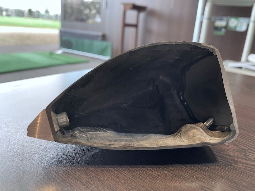 「B3MAX」のヘッドは3つのパーツで構成されている。ヘッドの”前(フェース)”と“後ろ(ウェイト)”以外は、カーボンという最先端かつ意欲的な設計だ。カーボンモノコックボディの採用によって生じた余剰重量をフルに生かし、ヘッド後方に最大40g超の重量を配置。“ほぼ10K”の大慣性モーメントを実現しており、流行りの“曲がらない・ブレないヘッド”となっている。