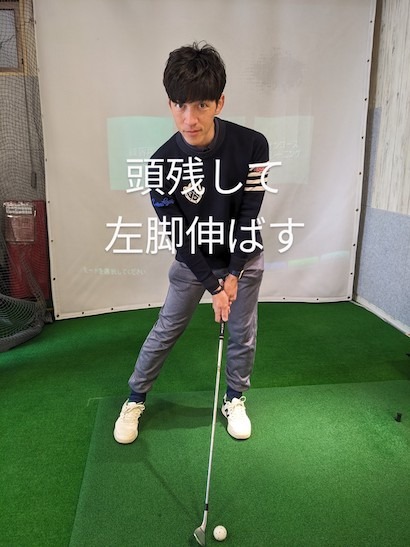 こうすると、クラブヘッドを左ヒザ~左腰の延長線上の高さで引っ張られるとき、頭を傾けなくても引っ張り合いを作れるちょうどいいバランスになると思います。