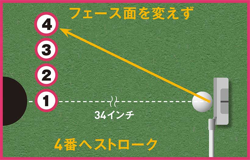 パッティングのインパクトにおける3条件のうち「フェースがスクエア」、「スイートエリアとボールの中心が一致」の2条件を満たすと想定した場合、パターの長さ(34インチ)の距離で、練習グリーンの平坦な面か上り斜面にボール4個を等間隔で並べる。打つボールの中心と1番のボールの中心が一直線に重ねフェース面を変えることなく、4番のボール方向へストロークします。このときボールはどこに向かってコロがりますか?