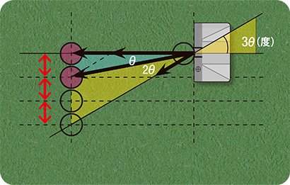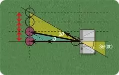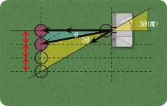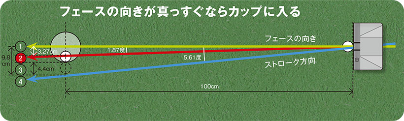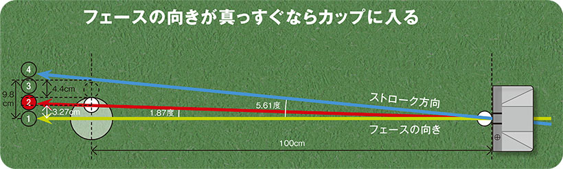 ストロークされたボールは赤い線上を通り、必ず「2番」に当たる。1番と2番のボール間隔を「1」とすると、1番と4番の間隔はその3倍の「3」。清永教授はこの関係を「初期ベクトルの1:3法則」と名付けた。もし3番や4番のボールに当った場合は、インパクト時のパターフェースがオープンになっていたと判断できる。もし1番のボールに当たるか、あるいはそれより右側へ外れた場合は、クローズフェースでのインパクトであったと判断できる。