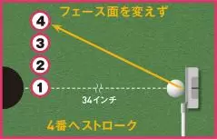 こちらのアウトサイドインのストロークのほうが「1:3の法則」を説明する場合に用いることが多いポピュラーな軌道。ストロークされたボールは赤い線上を通り、必ず「2番」に当たる。もし3番や4番のボールに当った場合は、インパクト時のパターフェースがクローズになっていたと判断できる。もし1番のボールに当たるか、あるいはそれより右側へ外れた場合は、オープンフェースでのインパクトであったと判断できる。