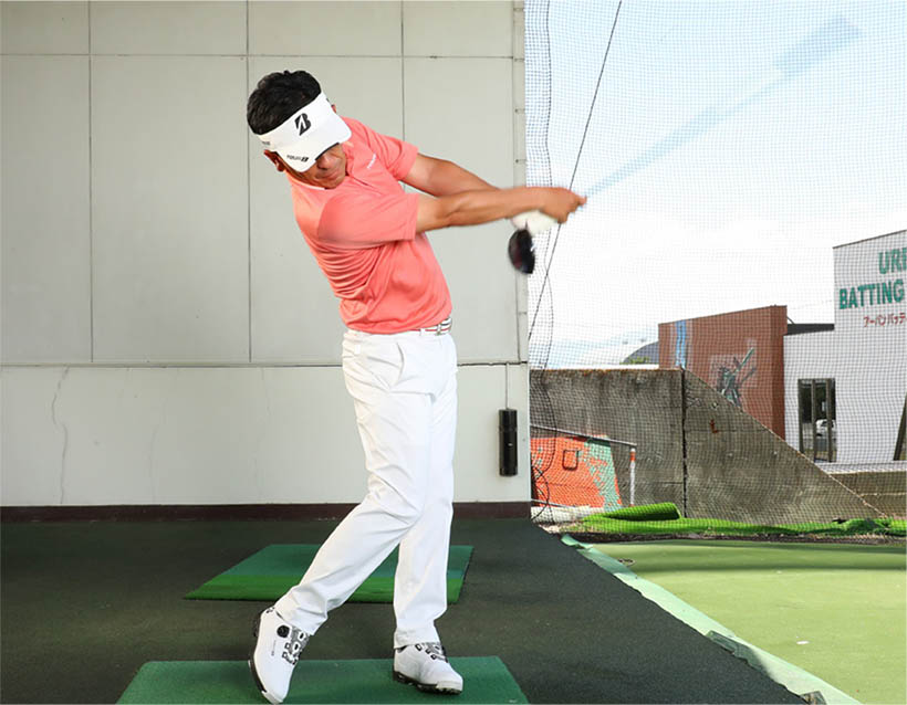 「スイング前にダイナミックストレッチをして筋可動を上げ、筋動員数を増やして上げれば、プロ選手で約0.3〜0.5パーセントの最大飛距離、一般の人では約0.7〜14パーセントの飛距離アップにつながります。飛距離だけであれば、クラブを反対に持ち連続してスイングをする! なるべく速く振る! この連続して速く振る練習で十分距離は伸びます。筋繊維の動員も増えますのでオススメです」(宮澤氏)
