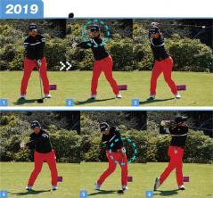 19年はバックスイングで大きく右に動いて、ダウンスイングからインパクトにかけて体全体を左に戻すスイングだった。