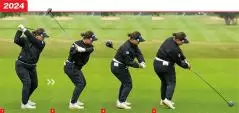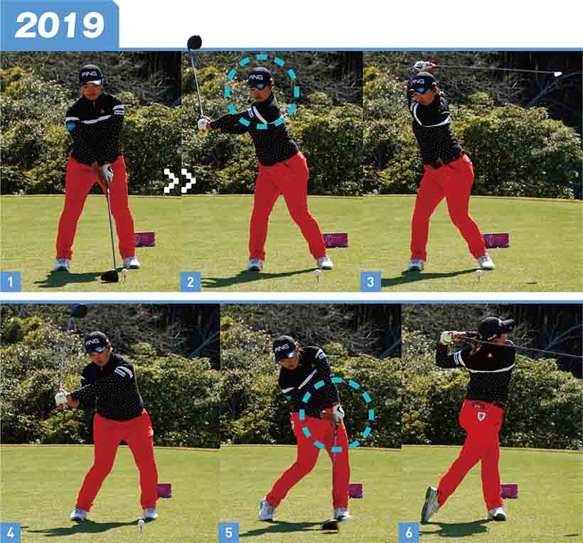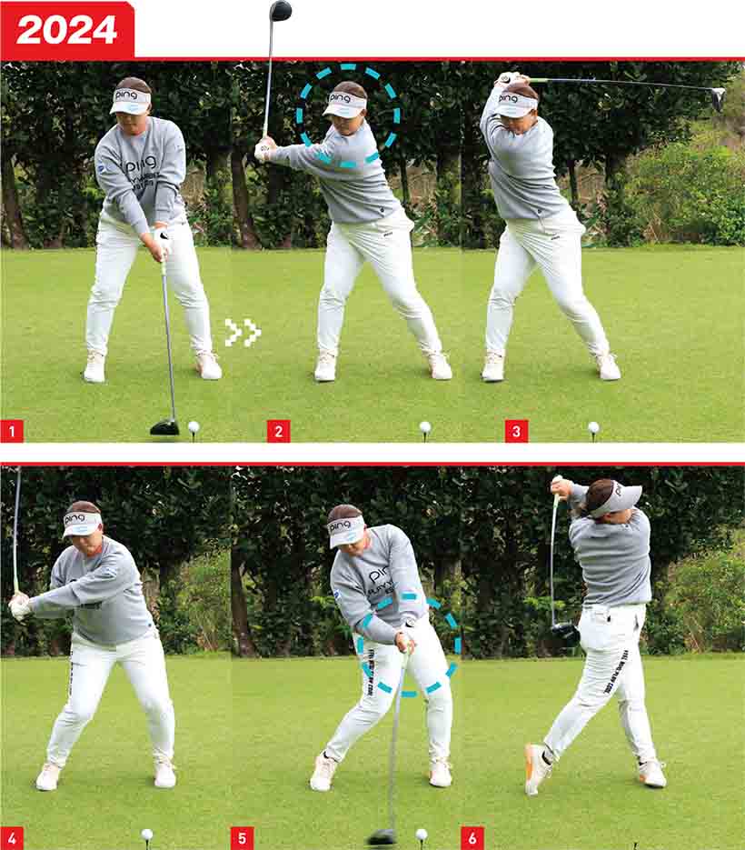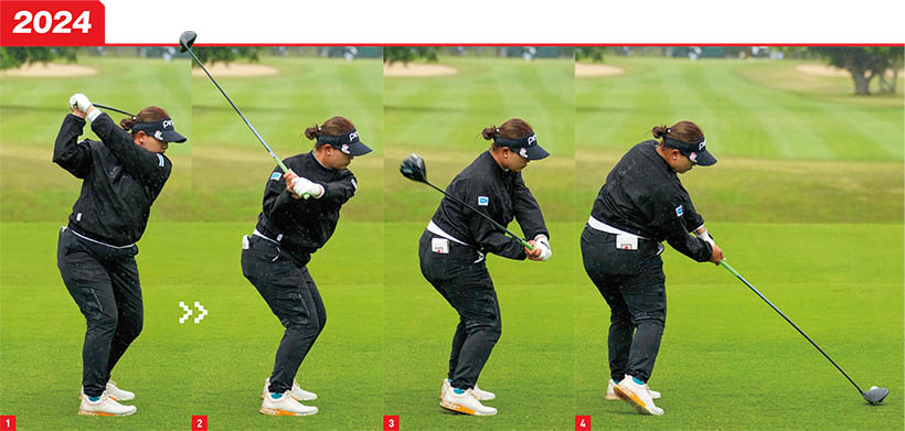 もう一つ、安定感がアップした要因はフェースの開閉がゆるやかになったことです。19年の連続写真を見るとダウンスイングの途中から一気にフェースを返していました(2019年_写真02,03)。24年は切り返し直後からフェースがスクエアに近い角度になっているので(2024年_写真02,03)、無理にフェースを返さなくてもスクエアヒットできます。再現性の高いスイングになりました。