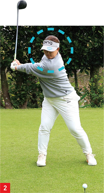 女子プロではトップでシャフトがクロスする選手も珍しくありません。鈴木選手もその1人でした。2019年はヘッドが顔の前に出るくらいシャフトがクロスして手元も背中側までループしています。
