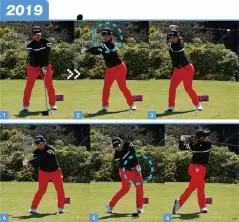 19年はバックスイングで大きく右に動いて、ダウンスイングからインパクトにかけて体全体を左に戻すスイングだった。