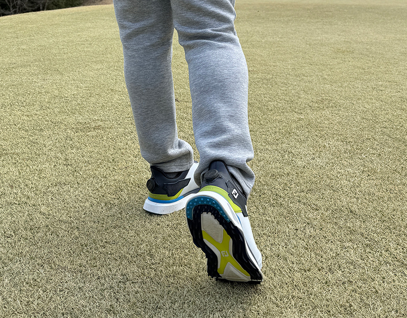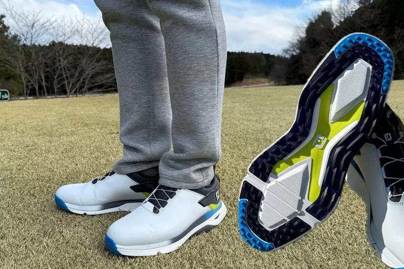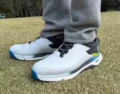 ショットしてみると、かなりのグリップ力を感じます。ソールが捻れるようなこともないし、フィット感がいいので、シューズの中で足が動いてしまうこともない。特に横の動きに対するグリップ力が強い感じで、スイング中に体が流れにくい気がしました。地面をしっかりとグリップしてれている感覚が強く、下半身がブレにくいです。さすがはツアープロも使用するモデルだな~という感じ。しっかりと地面を蹴っていける人はかなりこのシューズの恩恵を受けそうな気がします。