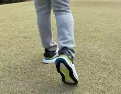 歩いてみると、意外と軽くて歩きやすい。ソールは硬くも柔らかくもなく、丁度いい。しっかりと曲がるところは曲がるし、フィット感が良いから歩いていてもシューズがしっかり足の動きについてくるので歩きやすいです。クッション性もフワフワでもカチカチでもなく、丁度いい反発感。スパイクレスなので、硬いところを歩いても突き上げ感などはありません。トラクションがソールの外周部にしかなく、中央部分が浮いているような感じなので、歩くと少し違和感があるのかと思いましたが、その心配はありませんでした。斜面や枯れた芝の上をあるいてみても滑るような感覚は全く無かったので、グリップ力はかなりいいと思います。