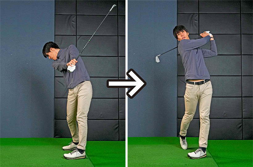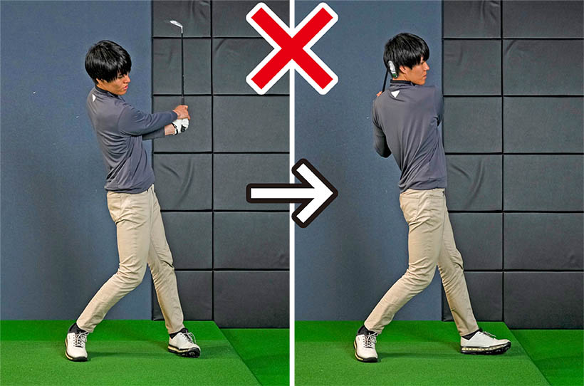 カタチとしてはよく見える場合もありますが、目標方向に出そうとした結果、体重が右足に残った状態で振り抜くような小さいフォロースルーになりやすいのです。