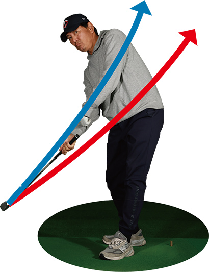 「張りのあるインパクトを求めると、そのまま両腕と肩の三角形をキープするイメージで大きく振り抜くプロもいますが、身体の負担を考えるとあまりオススメではありません」