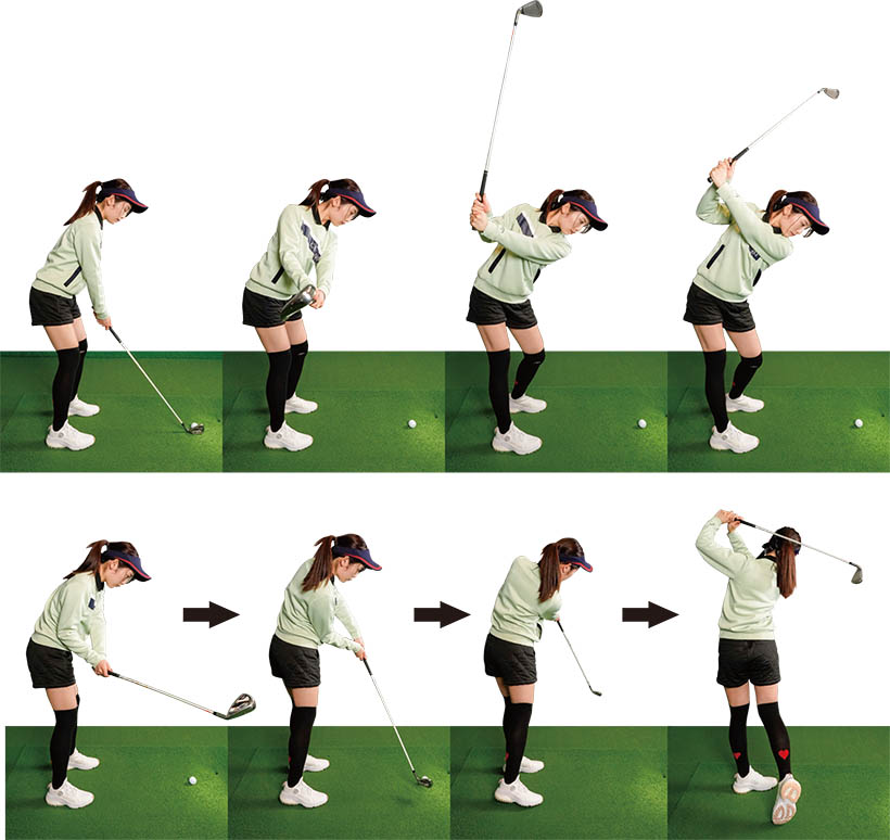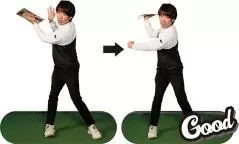 右手首が硬直してしまっている人は、右手だけでクラブを握り、足も体も腕さえも動かさず、手首だけでテークバックします。そしてそれを下ろすのも手首だけ。左右に180度、右から左へ軽く振ってみましょう。この動きで右手首の柔軟性が出てきます!