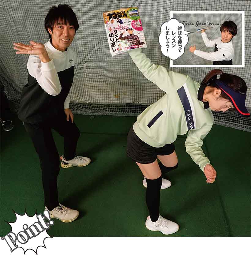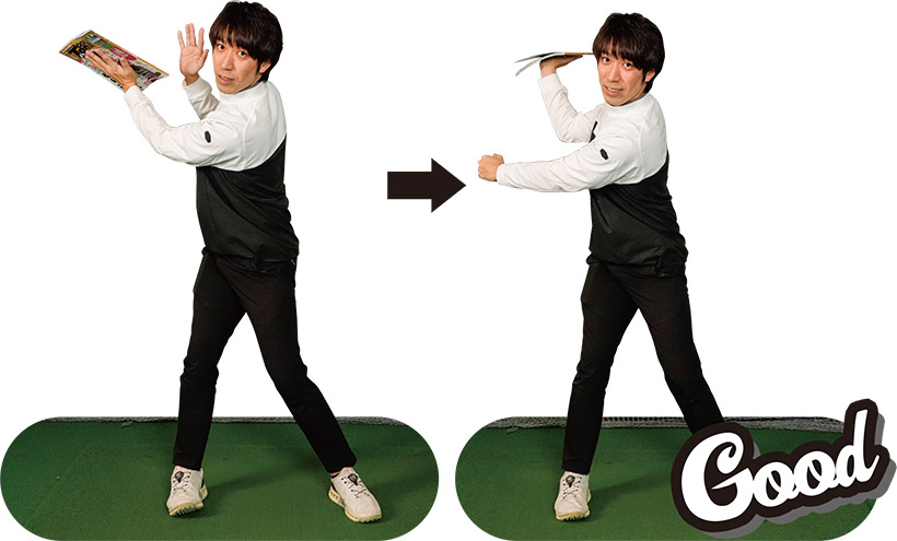 【雑誌をクラブに持ち替えて右手に左手を添えてみよう!】