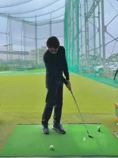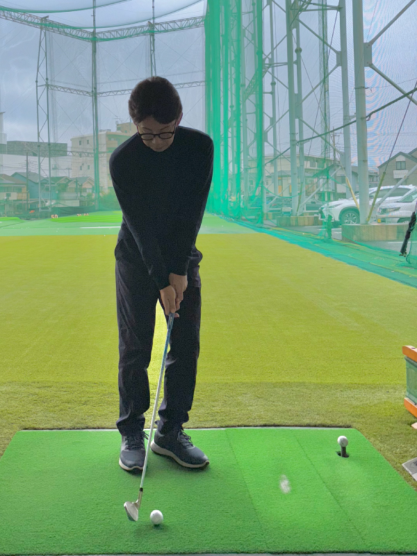 - 左足太もも内側にグリップがくるようにハンドファーストにする
