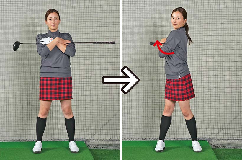 最初に直立の姿勢になり、クラブを胸の前に当ててください。その体勢のままで胸を右に90度回しましょう。